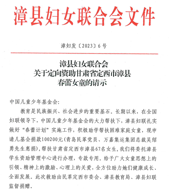 2月23日,甘肃漳县妇女联合会向中国儿童少年基金会发函申请定向资助甘肃定西市漳县春蕾女童,积极助学帮扶困难家庭。吴绍勇了解后积极协调儿基会有关部门,最终将善款转至漳县学生资助管理中心学生资助管理专户。